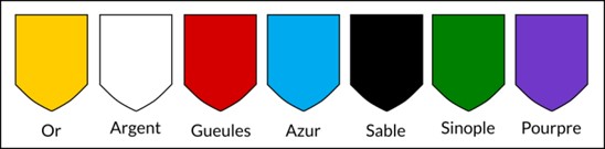 1/ Les armoiries prennent souvent place dans une sorte de bouclier, un écu dont le fond (le « champ ») est fréquemment coloré. 7 couleurs sont plus fréquemment utilisées, chacune désignée par leur terme particulier. D’ailleurs, il n’est pas réellement question de couleurs, mais de métaux (or et argent) et d’émaux (les 5 autres).